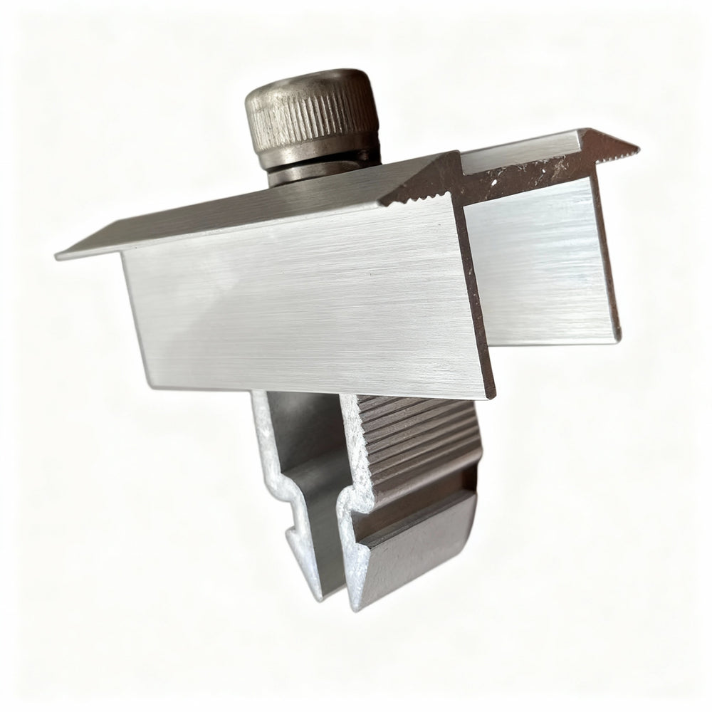 Universal Modulmittelklemme mit einfacher Klickfunktion zum Fixieren von Solarmodulen mit Rahmenhöhen 30-35 mm.